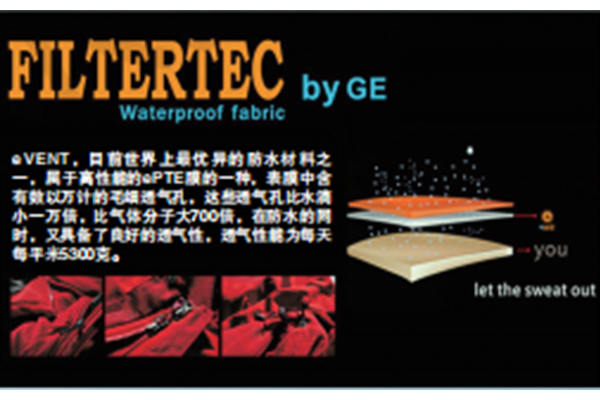 則EVENT使用了GORE-TEX面料的品牌沖鋒衣售價高達(dá)幾千上萬元,一般的戶外愛好者常常只能是“望衣興嘆”。而誕生比GORE-TEX略晚的EVENT面料的性價比似乎要高一些,兩者都被稱為頂級沖鋒衣的面料。EVENT技術(shù)上使用了與GORE-TEX完全不同的思路,它使用一種全新的EPTFE織物(不是覆膜)工藝,這種織物具有極其穩(wěn)定的化學(xué)性能,適用的溫度范圍更廣,而且耐老化。面料層的小孔雖然比EPTFE覆膜的分子透氣孔大,但是依然能夠稱職地將雨水阻隔在面料外部,即使最小的水珠(霧珠)也不能輕易通過。而且擴(kuò)大的透氣孔讓透氣性能幾乎與傳統(tǒng)織物面料沒有差別。