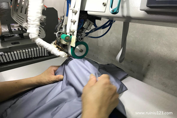 像是沖鋒衣的縫線會破壞防水效果,所以在沖鋒衣的全件各縫接處里布那里都會有壓膠層的。請看一下示意圖:【注:一下是思諾華工廠真實(shí)生產(chǎn)圖片】