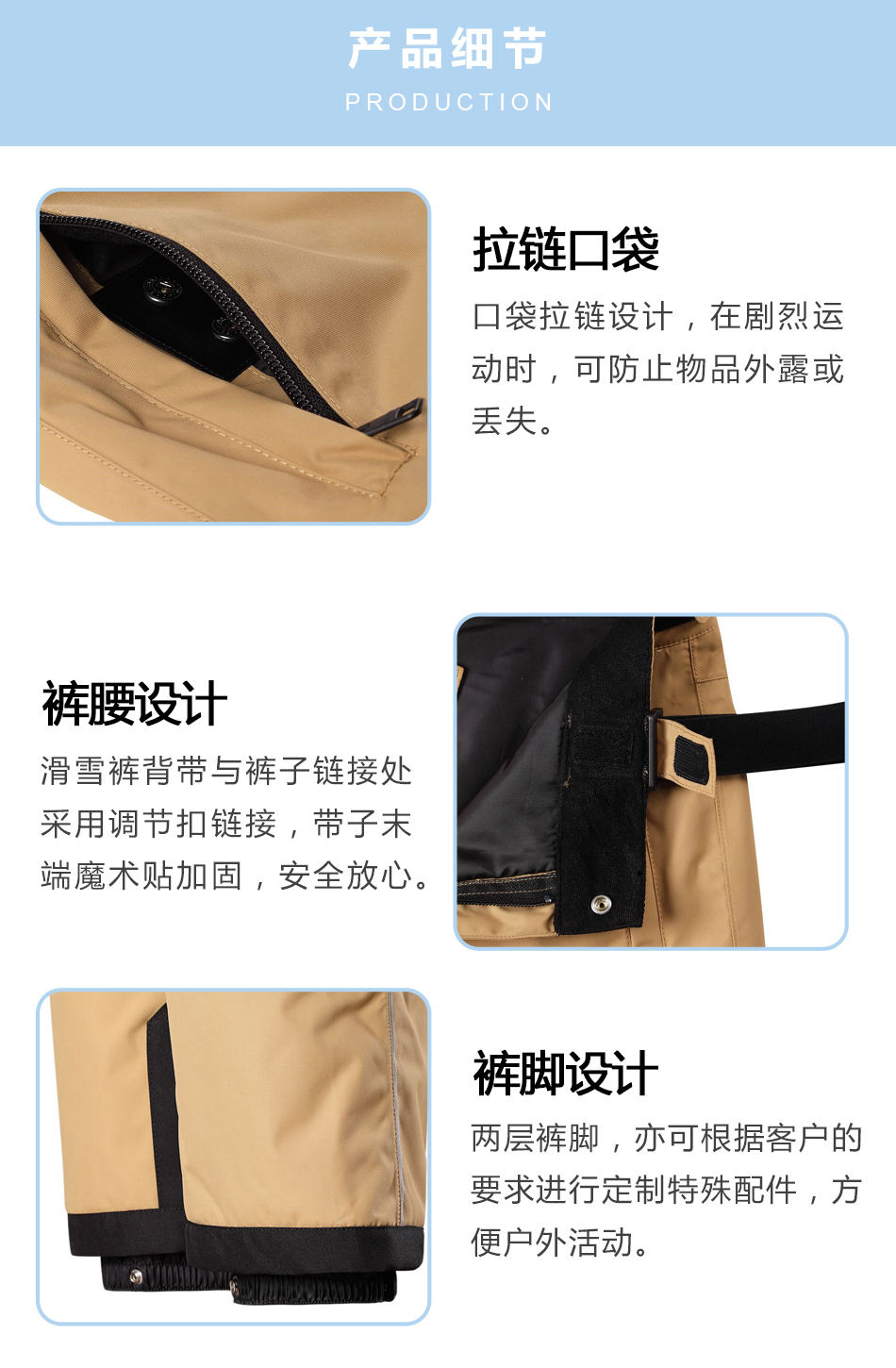 褲腰設計:兩層褲腳,亦可根據客戶的要求進行定制特殊配件,方便戶外活動。