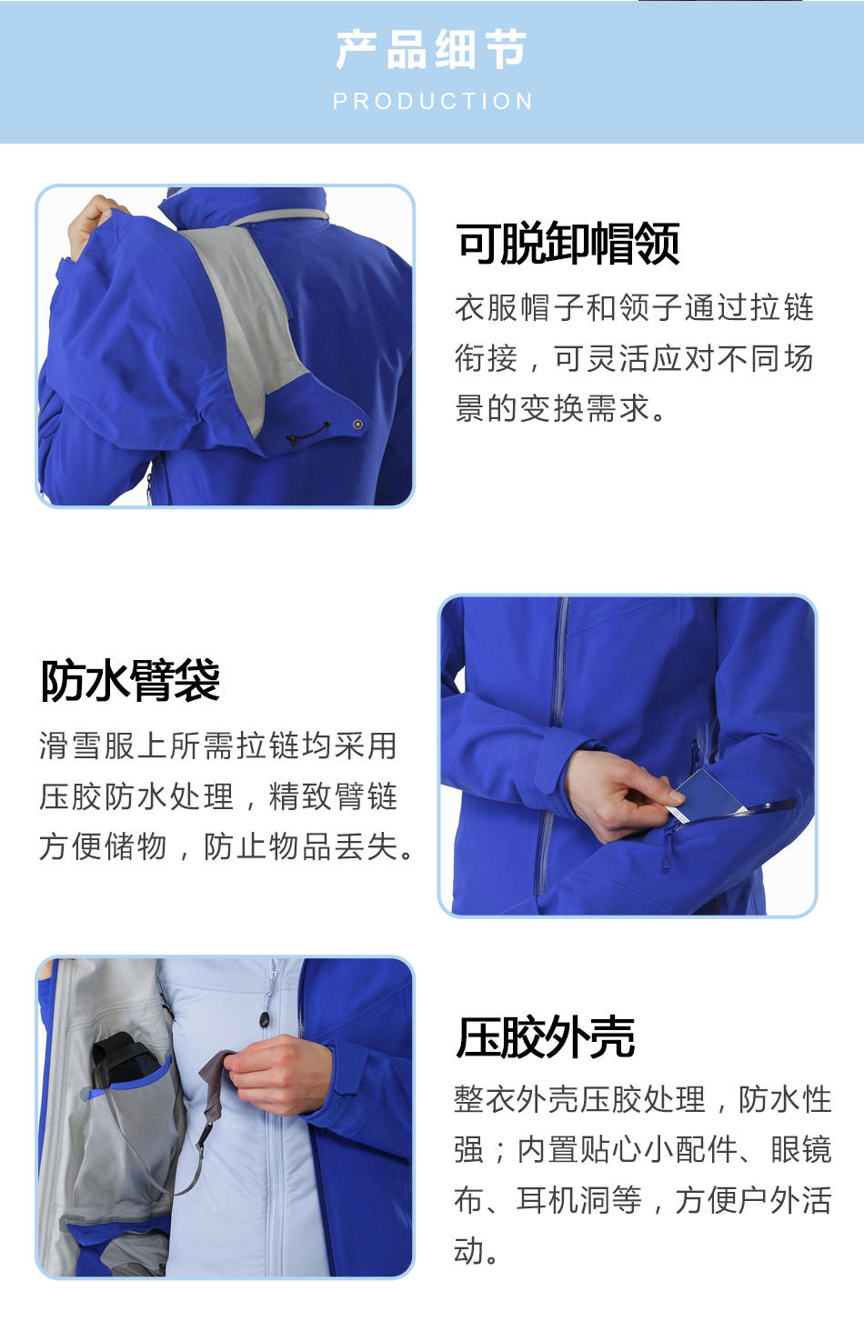 壓膠外殼:壓膠滑雪服加工整衣外殼壓膠處理,防水性強(qiáng);內(nèi)置貼心小配件、眼鏡布、耳機(jī)洞等,方便戶外活動(dòng)。
