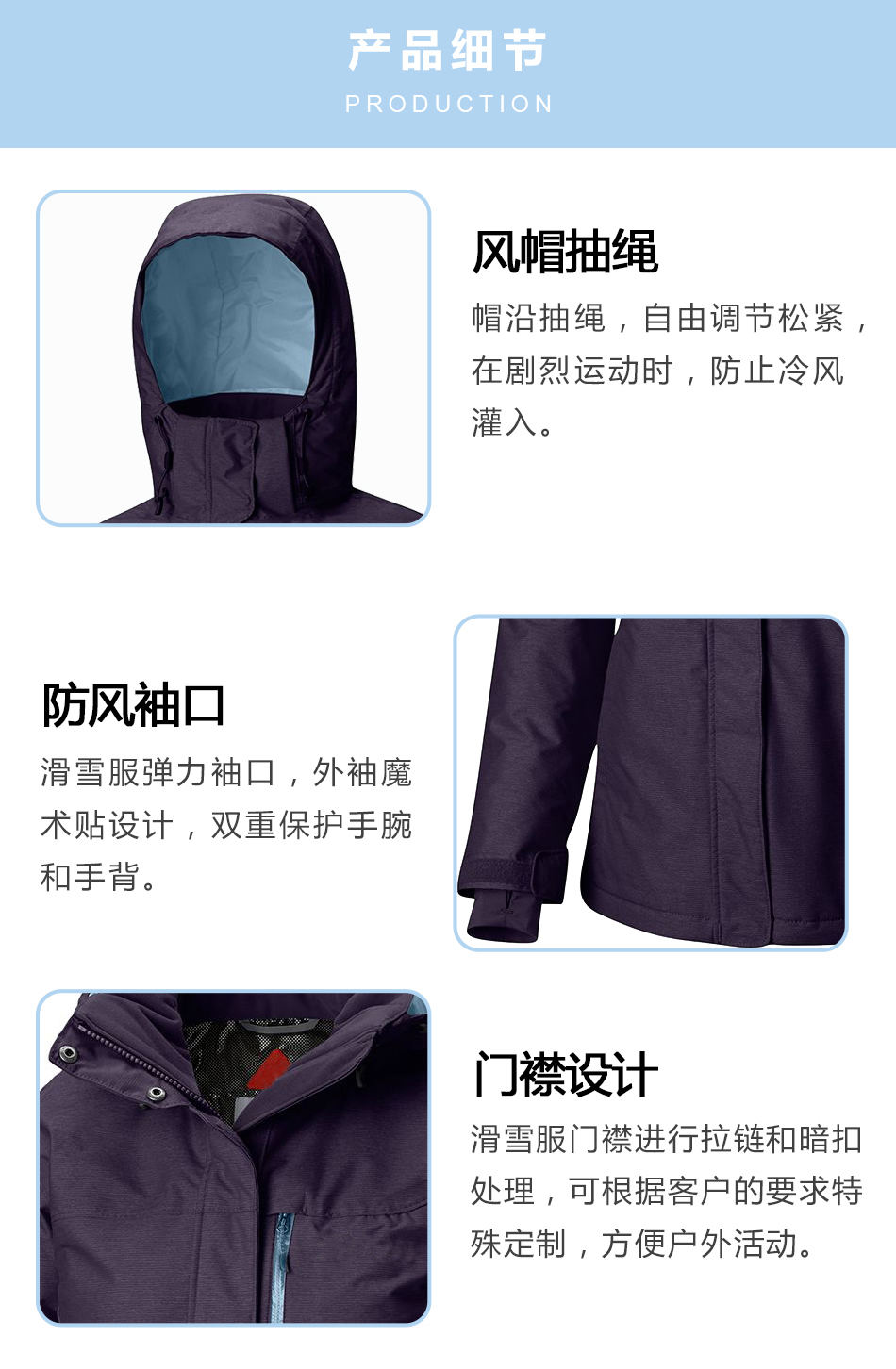門襟處理:滑雪服生產的門襟進行拉鏈和暗扣處理,可根據客戶的要求特殊定制,方便戶外活動。